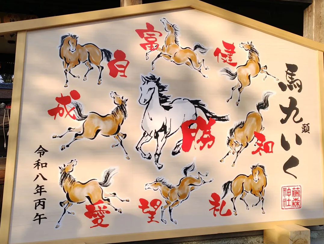 9頭の馬を描いた[馬九いく(うまくいく)絵馬]で九つの幸せを表現されています。